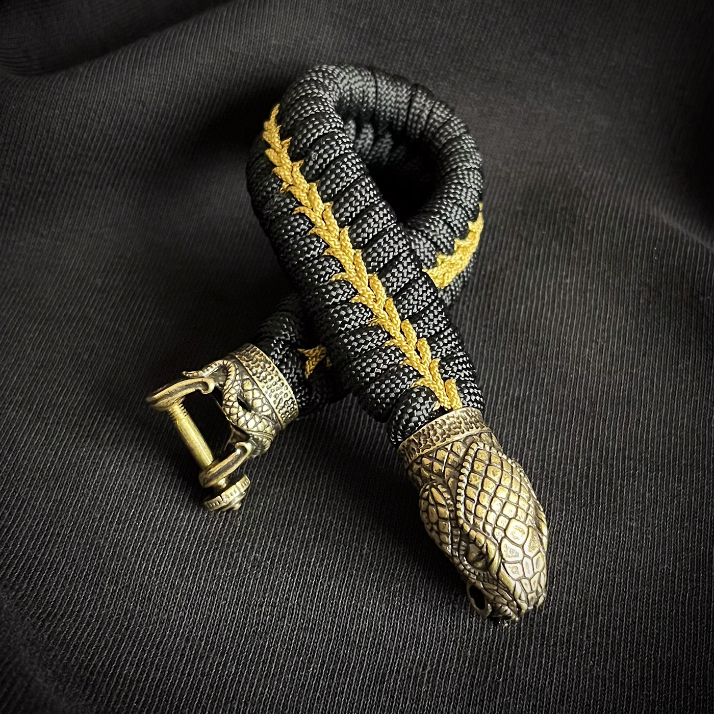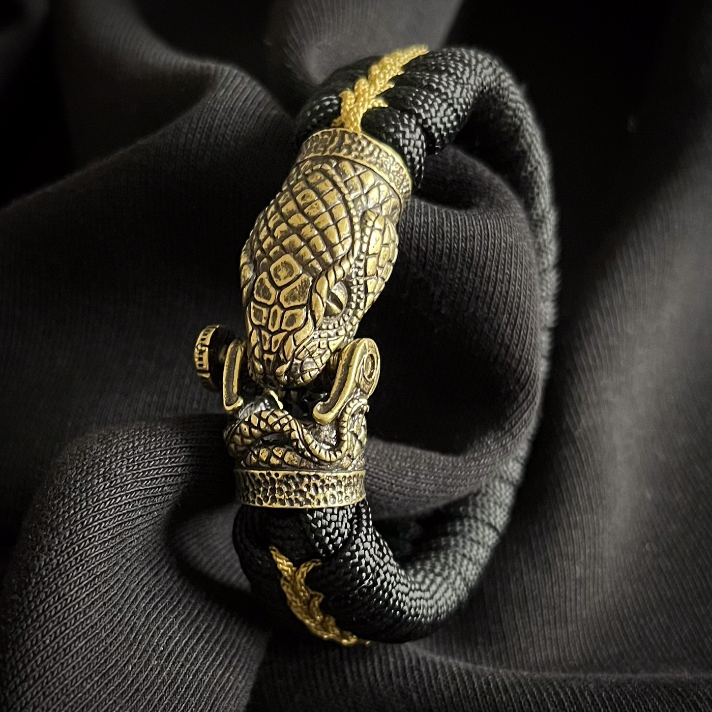 Schwarz als Grundfarbe mit goldenem Zierfaden im Fishtail-Muster. Das ganz wirkt sehr edel und ruhig sodaß der Schlangenkopfverschluss toll zur Geltung kommt.
