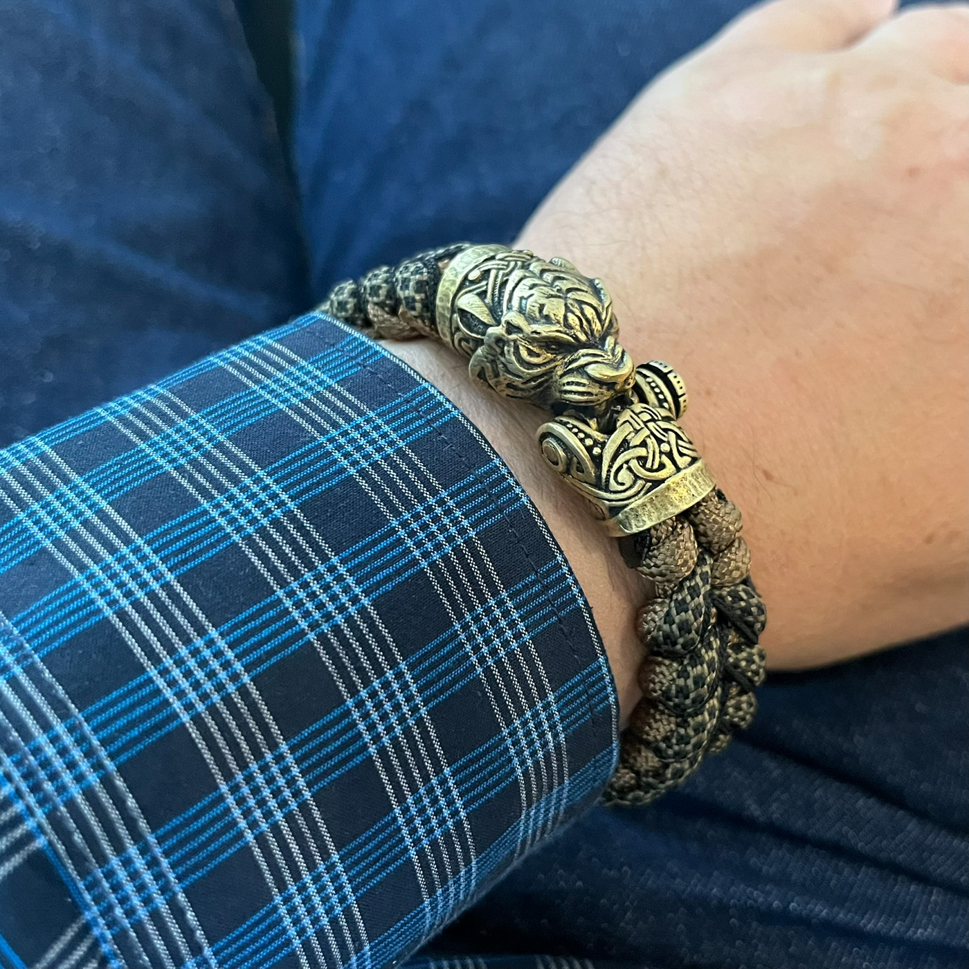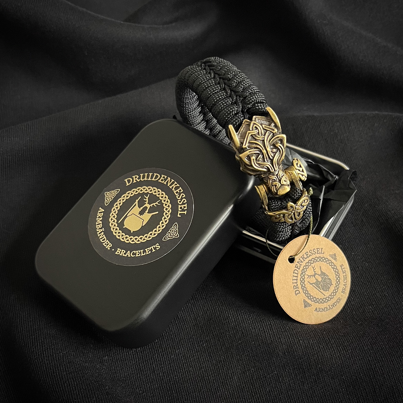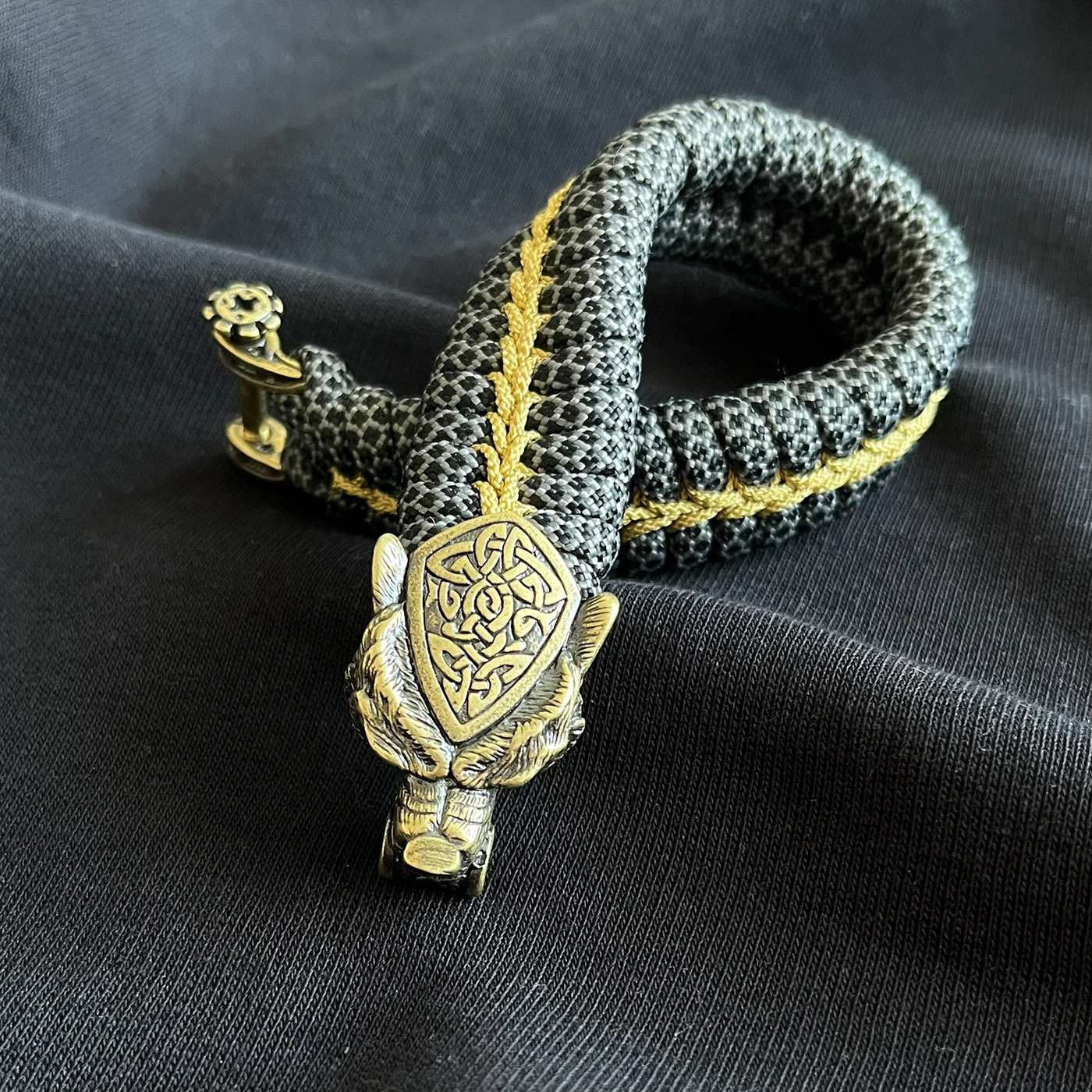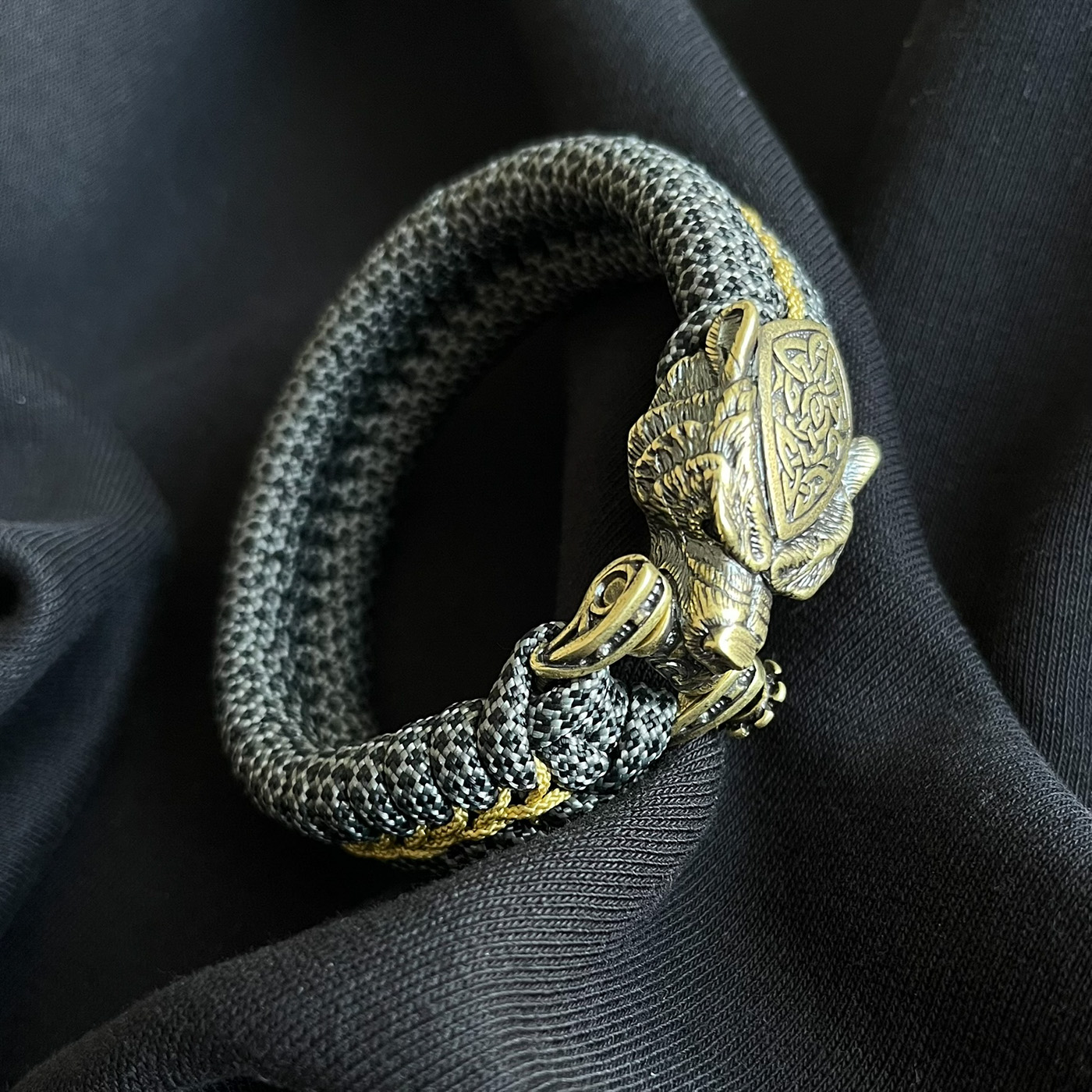 Ein sehr detailreicher Bärenkopf mit keltischen Muster aus einer stabilen Messinglegierung. Hier mit Grau/schwarzen Band als Grundfarbe in tollem Kontrast zum goldenen Stitching. Durch das Fishtailmuster (Art der Knüpfung) ist das Armband verhältnismäßig weich und anschmiegsam. Es sind viele Farbkombinationen möglich. Fragt einfach oder lasst Euch von mir beraten. Aus hier wäre der Preis 75,- Euro. Nutzt das Kontaktformular.