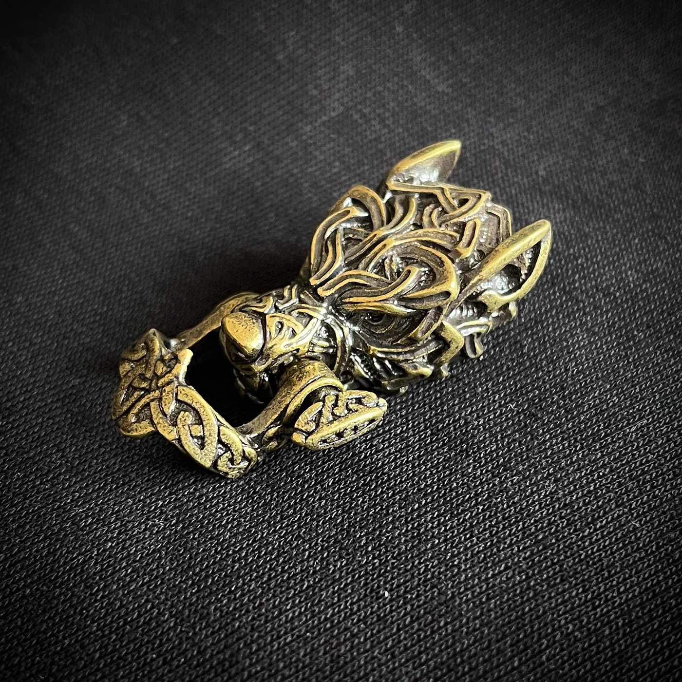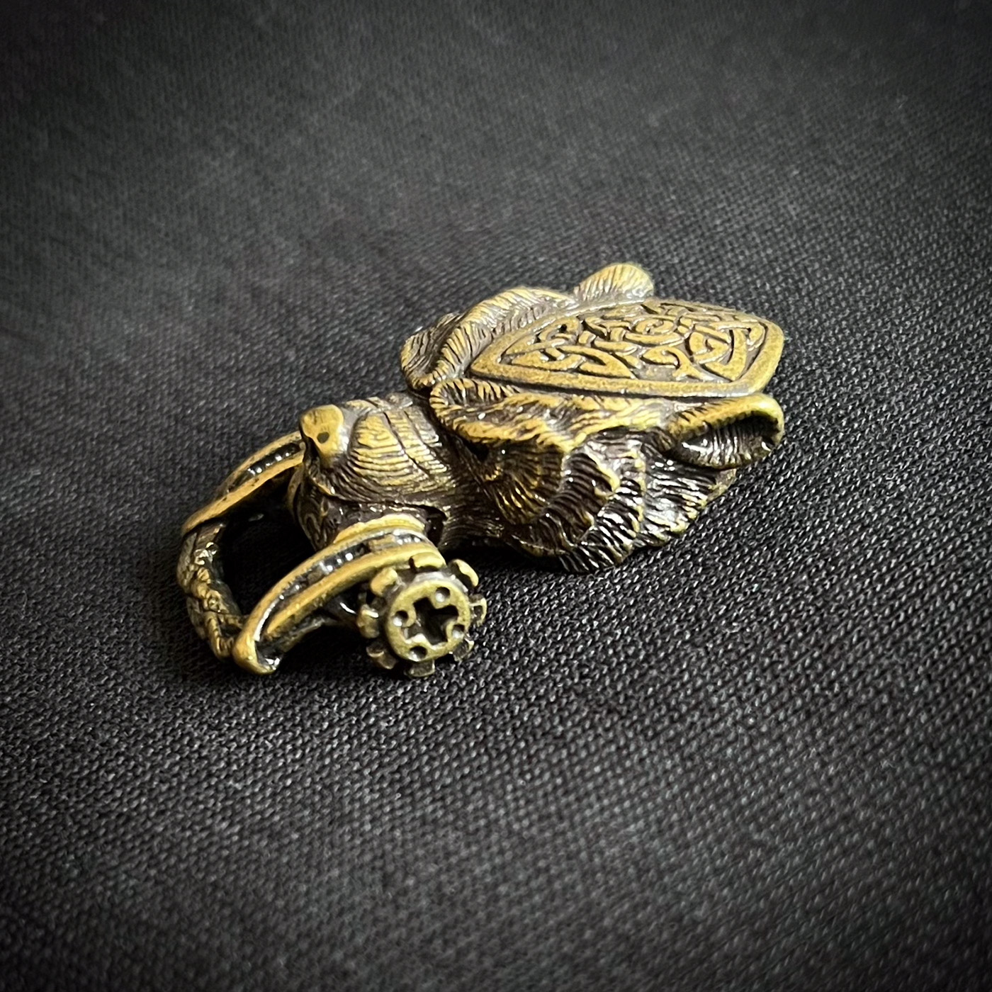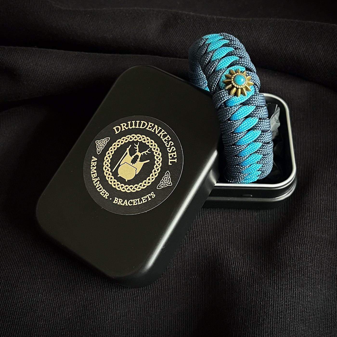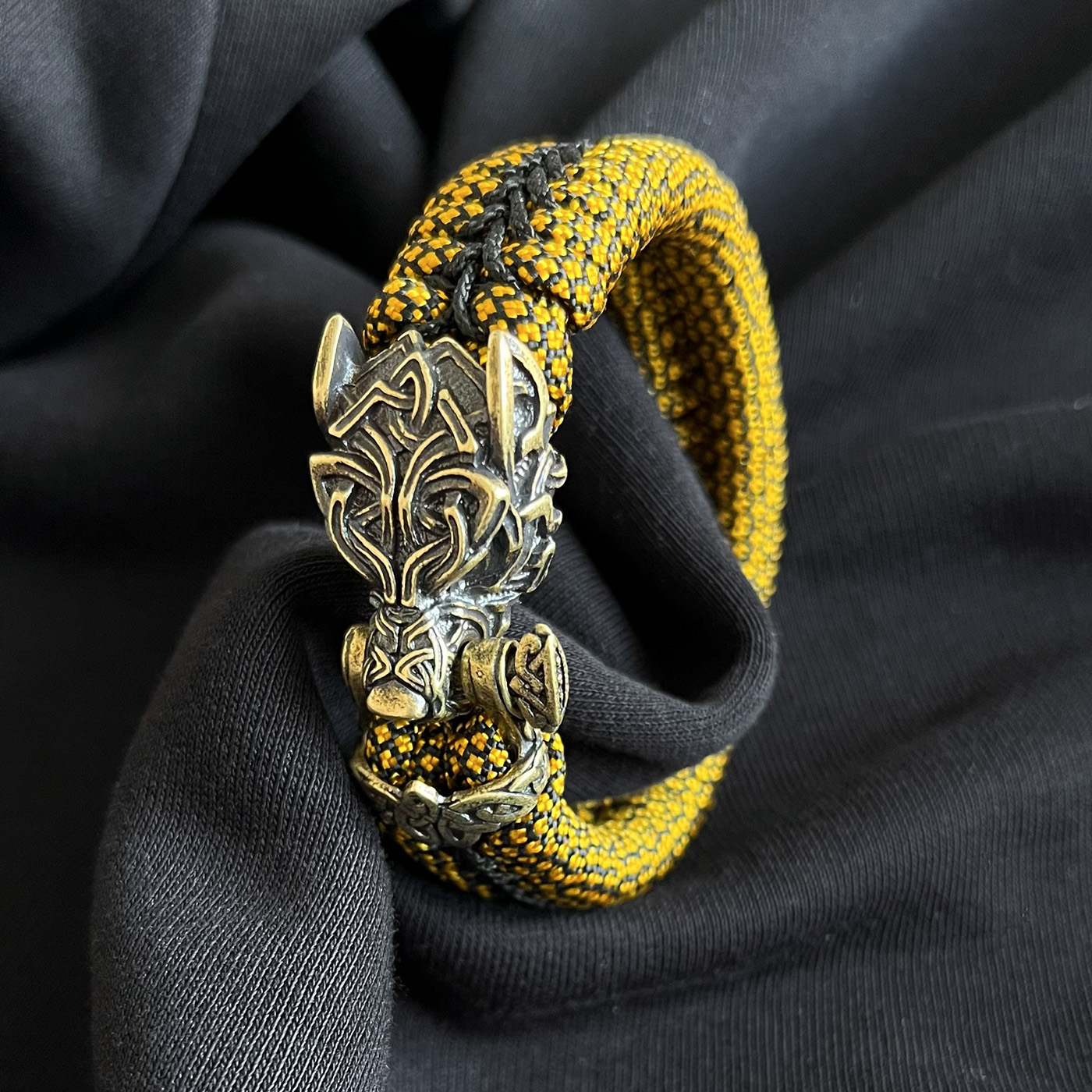Ein sehr detailreicher Bärenkopf mit keltischen Muster aus einer stabilen Messinglegierung. Hier mit Grau/schwarzen Band als Grundfarbe in tollem Kontrast zum goldenen Stitching. Durch das Fishtailmuster (Art der Knüpfung) ist das Armband verhältnismäßig weich und anschmiegsam. Es sind viele Farbkombinationen möglich. Fragt einfach oder lasst Euch von mir beraten. Aus hier wäre der Preis 75,- Euro. Nutzt das Kontaktformular.