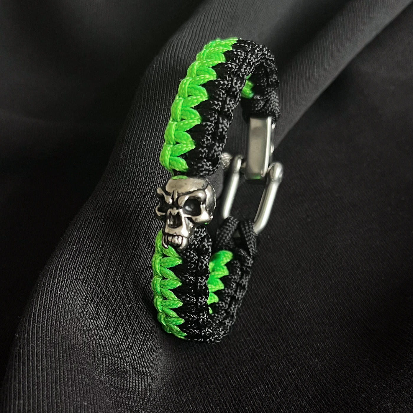 Ein Armband der etwas anderen Art. Die 2 Farben waren Kundenwunsch. Das Besondere ist der verstellbar Verschluss in Schäckel-Ausführung aus Edelstahl. Der Totenkops-Bead passt einfach super zur Knüpfung. Preis wären 45,- Euro